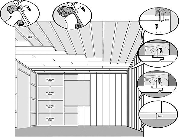 Dit betekent dat in een plafondconstructie mat maximaal toegestane h.o.h. afstand van de rachels van 300 mm, platen van 1220 x 620 mm, niet alleen langs de plaatranden, maar ook in het vlak van de plaat op de rachels bevestigd dienen te worden, daar waar u niet kunt schroeven, spijkeren of nieten adviseren wij montagekit aan te brengen.